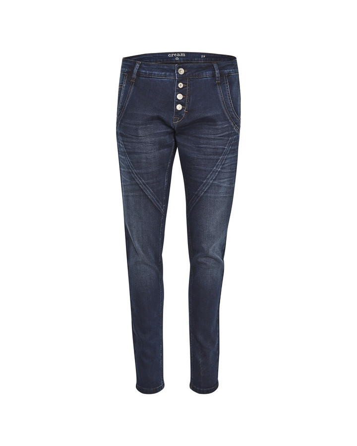Jeans från Cream. Dessa byxor har en normal midja, en diagonal söm på låret och synliga knappar. Jeansen har två fickor fram med extra dekorsöm och två påsydda fickor baktill. Matcha gärna med en stickad tröja för en snygg höst-look!
